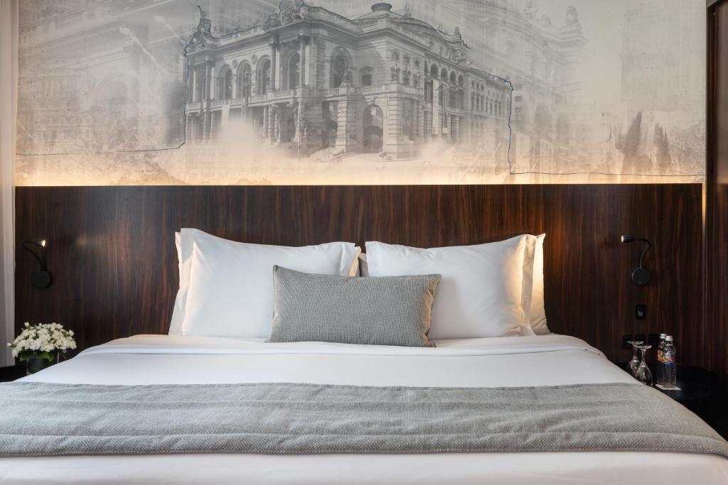 Cama king-size com lençóis egípcios, vista para o skyline paulistano e iluminação ambiente pensada para casais. Cada suíte foi decorada com detalhes que evocam o centro histórico de São Paulo.